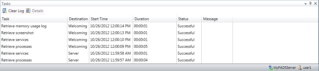 Some tasks are not listed in the tasks window (like retrieving the viewer connection information on a PADS4 Server), because this information is instantly available and not retrieved by executing a task.
